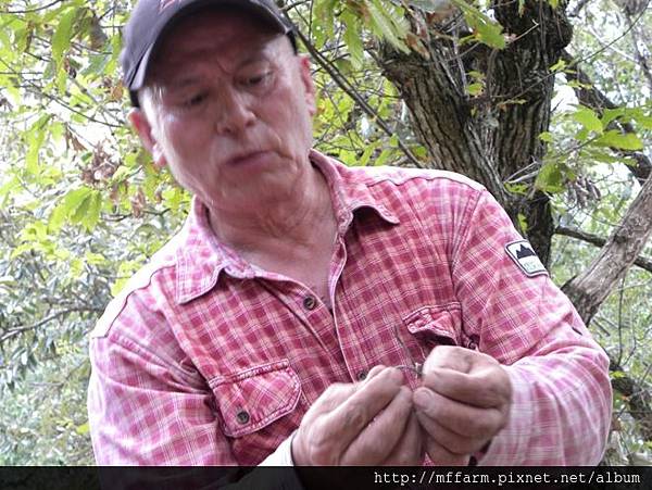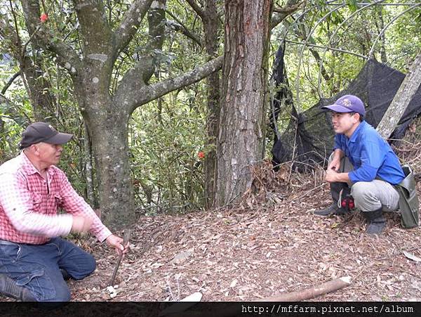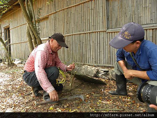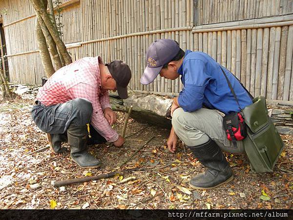 解說員呂家麒先生在一旁詢問烏毛大哥做陷阱的細節。