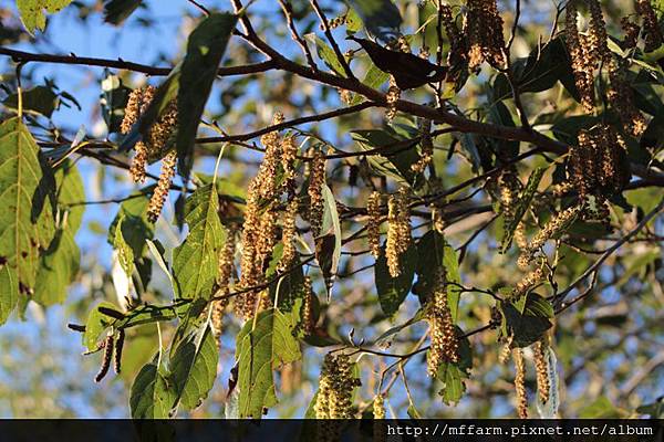白楊步道觀景平台上的赤楊雄花在晨陽下顯得耀眼。