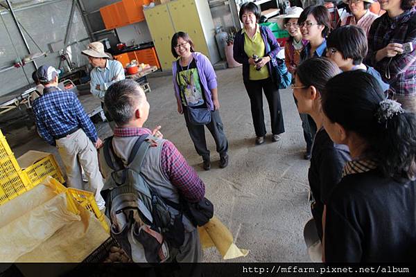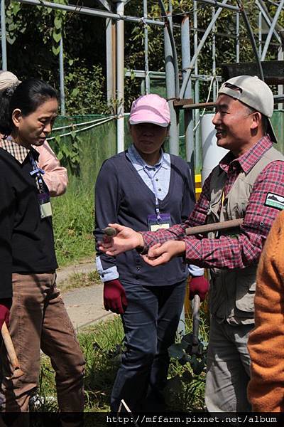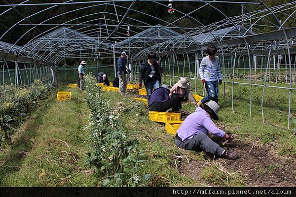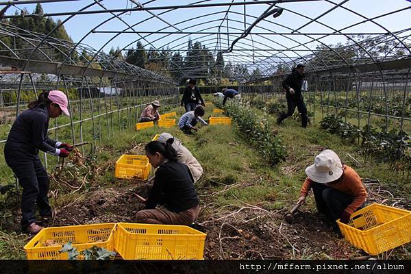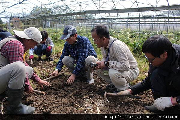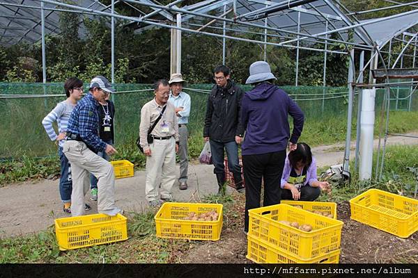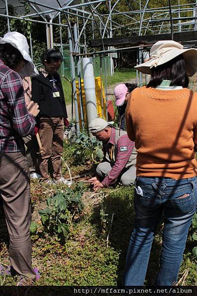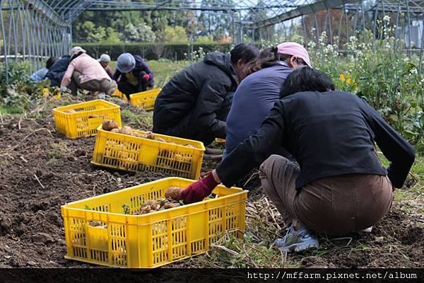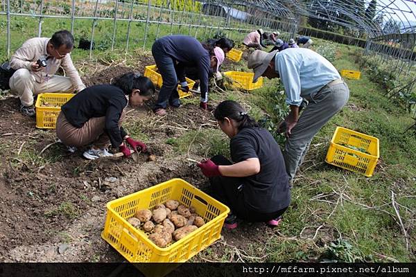 14日清晨的晨喚,大家在觀景平台迎接日出,在陽光的撫觸下,伸展已久未放鬆,呈現緊蹦僵硬的體軀,眺看遠山,和鳥禽群峰一起真正的醒來,迎接一天的展開。用過早餐,我們前往溫帶花卉區認識不同溫帶花卉的姿態、各種香草植物的氣味與觸感、品嘗香草查的芬芳,然後就到了勞動時間了。一人一把鋤頭,一雙手套,我們要來體驗挖馬鈴薯嘍!大部份人都是首次初體驗,看看大家的表情還真有點像是在考古般的小心謹慎呢!