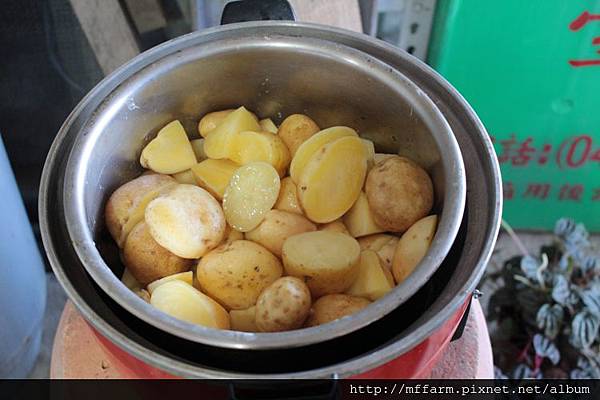 一邊挖馬鈴薯,3位朋友則在告一段落時,先回到花蔬包裝場協助甜菜根汁與蒸馬鈴薯的工作,等到大家的挖馬鈴薯活動結束後,就可以回到花蔬包裝場,用嘴巴來嘗嘗這些在地的滋味。然後每個人可以帶一公斤的馬鈴薯回家,當作此次參與活動的禮物,相信這些自己親手挖掘的馬鈴薯,嘗起來的滋味一定特別深刻與珍貴吧!