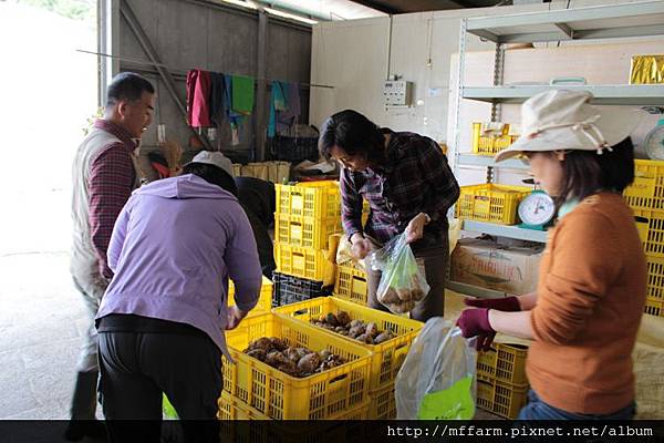 把大家挖起的馬鈴薯集中,一起運回花蔬包裝場整理分級。