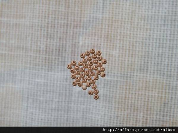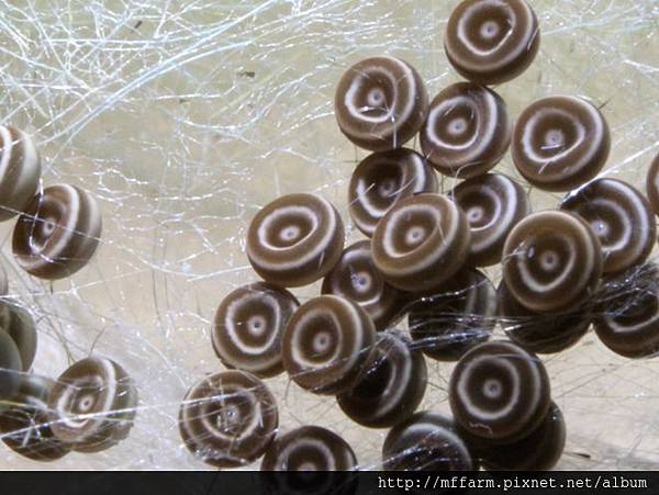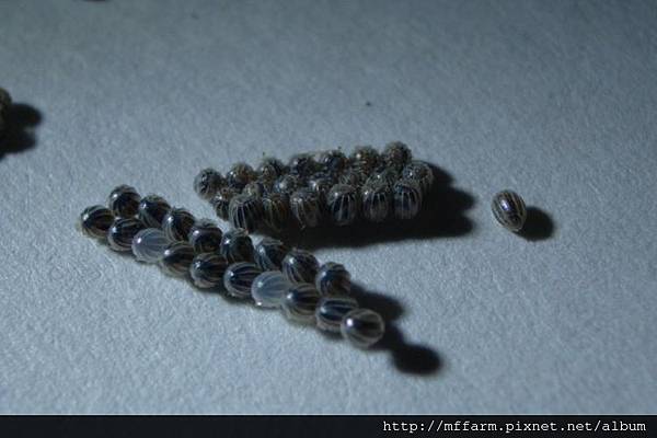 若是我不告訴你這是蛾卵,您大概要以為究竟是哪裡買來的串珠,被黏在玻璃上頭吧!只要用針帶著細線穿過,就是一串美麗的裝飾品了。仔細審視它那高貴典雅的顏色,光滑無比的質感,幾乎接近珍珠的光澤,很難想像是含藏著生命的東西呢!而這種卵就是被產在玻璃門上頭,讓人再次對蛾媽媽的率性隨意感到驚訝與無可奈何。