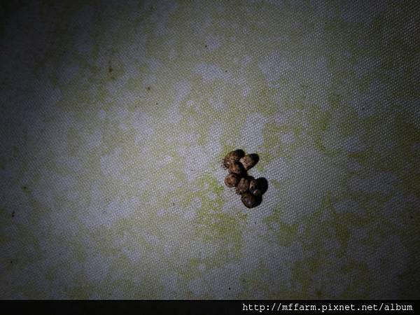 要是不仔細分辨,可能要以為這是迷你型山羌大便或是受潮咖啡豆了呢?這是一種翅膀展開跟手掌差不多大的天蠶蛾卵粒。和前兩者不同,它是被成堆產下在布幕上,呈疊羅漢態勢。大自然對秩序、規則的要求不若人類堅持,卻都有祂自己的細密心思藏匿其中。