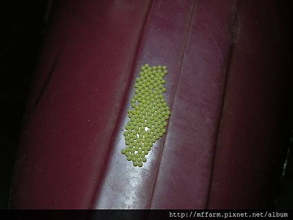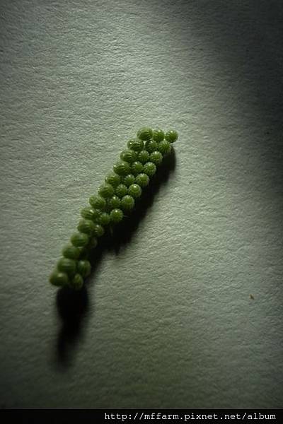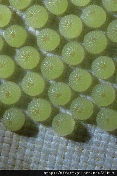 翠綠的顏色,讓了看了有一種清涼滲入眼眸。而它的造型有些接近哈密瓜,就姑且讓我們用哈密瓜來形容它吧!這是臺灣特有種的蛾類「張氏尾尺蛾」的卵,牠一次生產雖分成幾個段落,卻總共可以生下將近兩百顆的蛋呢!可謂多子多孫多福氣!而蛾媽媽在產卵時,也彷彿依循著一種秩序,卻又不僵化固著?而遠古流傳而下的本能,到底是怎麼被牠儲藏在身體裡的呢?
