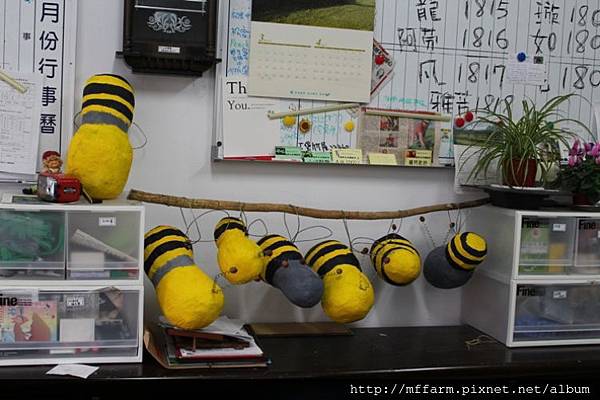 用報紙做的小蜜蜂,正在辦公室內等待晾乾中。
