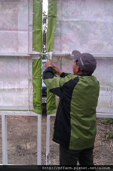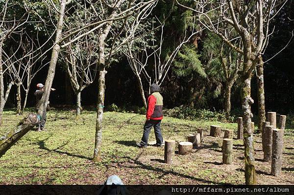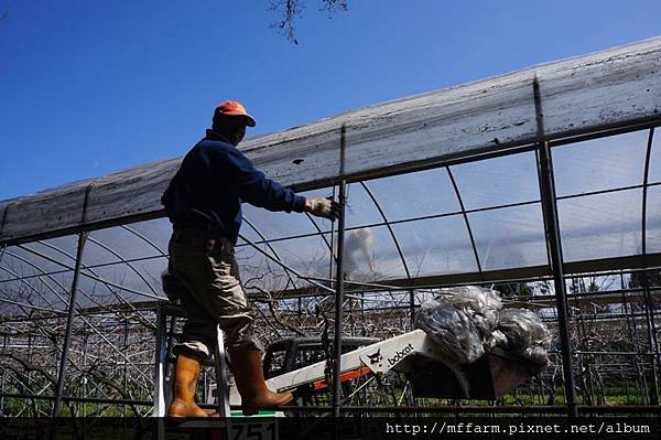 經營組的工作人員為即將開花的水蜜桃園鋪上塑膠布。