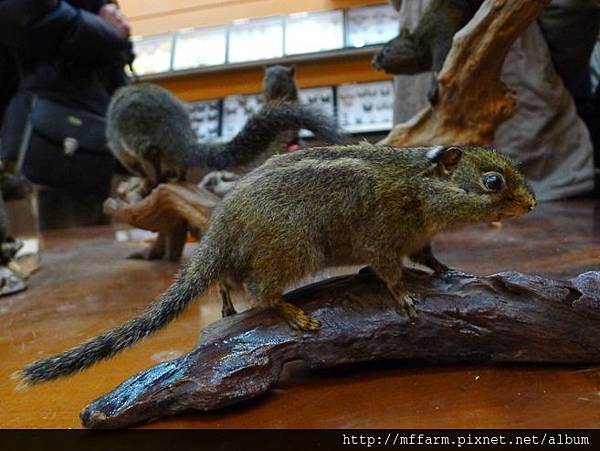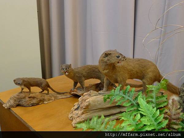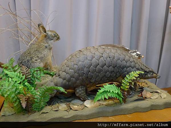 除了在森林裡漫步,我們也參觀了動物標本館(聽說另一組沒有這個行程,我們可是非常的幸運呢)。動物標本館的標本來源大部分都是員工在農場裡遇見溺死、撞死或其他因素而落在森林中的動物遺體時帶回製成。標本館內也有許多蛾類、蝴蝶和甲蟲類的標本,都是曾經出現在農場內的昆蟲,種類非常多元。除了知道標本來源外,也聽到一則美麗的故事,關於場內員工與德國蛾類專家的美麗情緣,還有薛認養的一隻虎鶇標本。