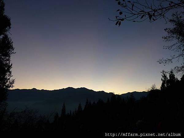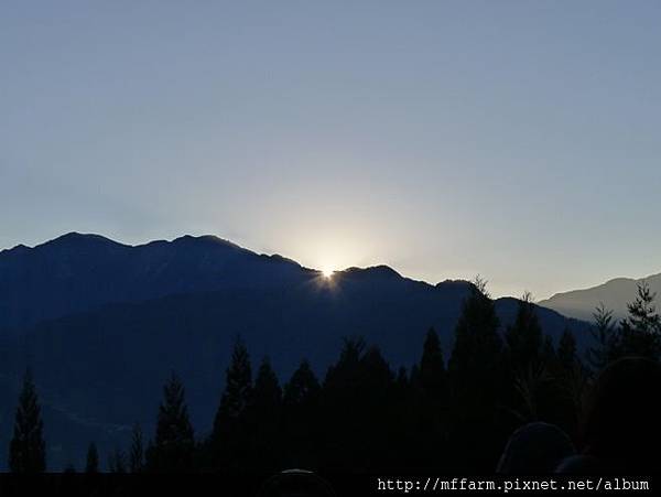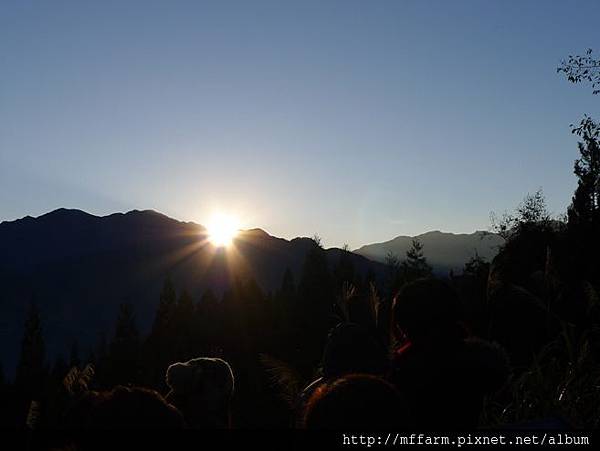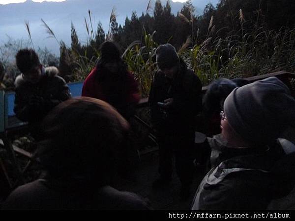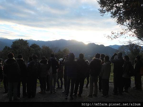 從原本的五、六位同學觀星到後來幾乎全員到齊,約莫六點多,大家繼續往瞭望台移動,準備迎接曙光。塔塔加的海拔為2610公尺,梅峰則有到2700公尺,不過仍然不夠高,天都亮了仍未見到太陽公公的笑臉,據說月亮下山要日出的這段期間最冷,冷的大家直發抖,還好漸漸的七點左右太陽終於在山頭間露臉才逐漸回溫。