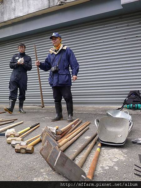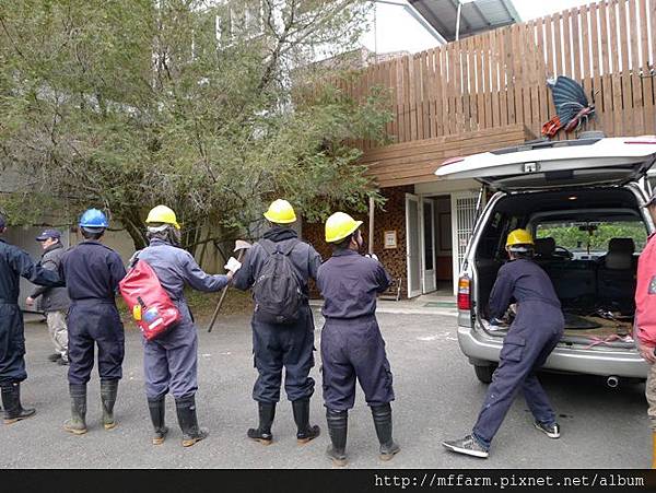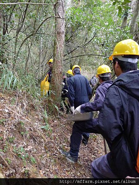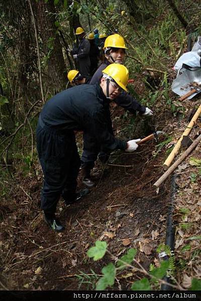最後是手作步道的部分。在集合時先進行分組,一些女生們被編列為「七仙女組」,在園區內進行做台階的工作。其他人步行,而老師則開車幫忙將工具載到車道的盡頭,我們再分工合作的移動工具前進森林更深處。