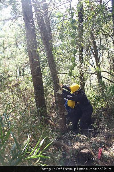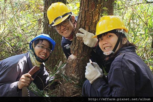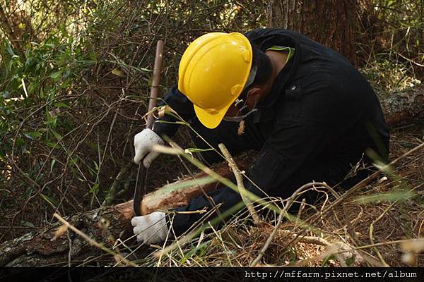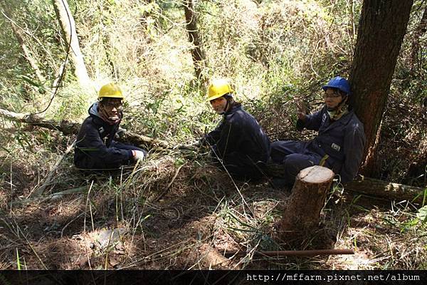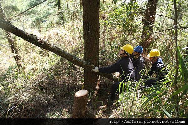 伐木組有三位同學,當大家在做步道時我們往上爬尋找適合的樹木。這裡的樹種主要以二葉松為主,往上有些陡,只能手腳並用的抓著旁邊的雜草往上。大一的時候曾有一次的砍樹經驗,是到溪頭的疏伐區砍樟樹,想不到隔了四年,居然還有這個機會,不過這裡教的砍樹方法和那時候學的有點不太一樣就是了。老師在最後的座談也提到,在台灣除了溪頭及梅峰實驗農場裡砍樹是合法的,其他都算犯法,能有這個機會可以體驗也是一種珍貴的經驗。