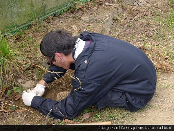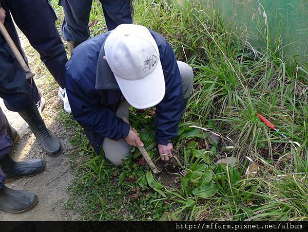水道的整理基本上也是除羊蹄的工作,不過需連其他雜草一併清除。阿雄老師先行示範,除了燈草和木賊之外都要拔除,期間大家也挖到一些奇妙的東西,如被咬一半的馬鈴薯、對面田飄過來的種子長大的蘿蔔、廢棄水管等,其中有一種雜草長得很像燈草,可留可不留,同學不小心誤拔還將它種回去,建立一小區的「植物復育區」,但因為太不起眼仍常常被其他同學踩到或壓到。
