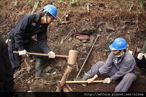 第一天大家的工作差不多都是維護之前做的步道以及挖上邊坡的工作。第二天有了木材,開始體驗如何使用Bar、打木樁、砍樹、削樹皮等等,大家都覺得非常有趣及非常的有成就感。削樹皮的感覺就像是在削甘蔗,因為樹砍下來之後會從樹皮開始腐爛,因此將樹皮削掉比較不容易腐爛或是延緩腐爛速度。