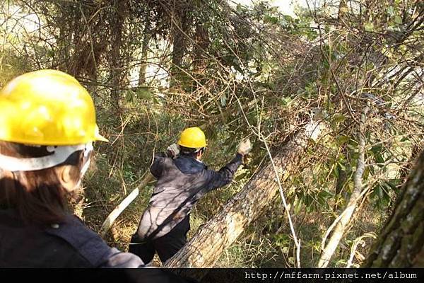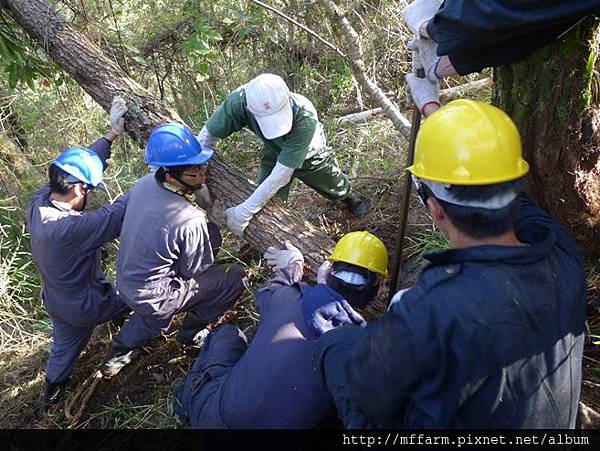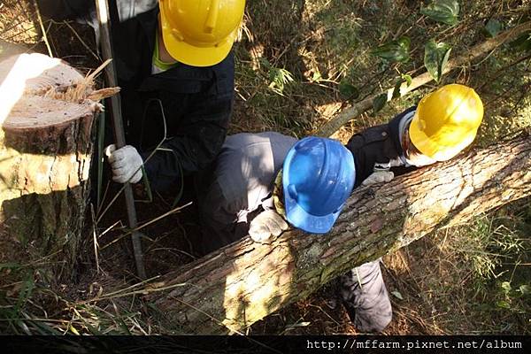 右圖則是樹已被砍斷但沒有倒下,只有移位,我們決定先將樹垂直推到地上再推倒