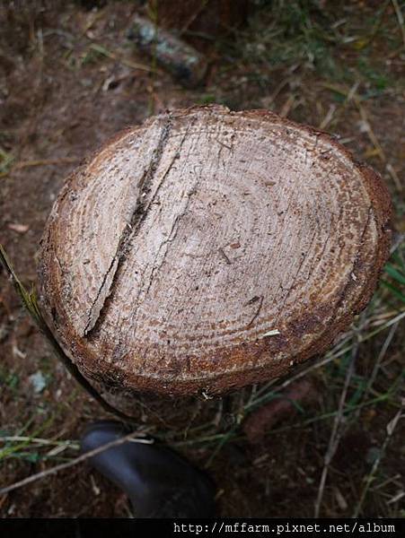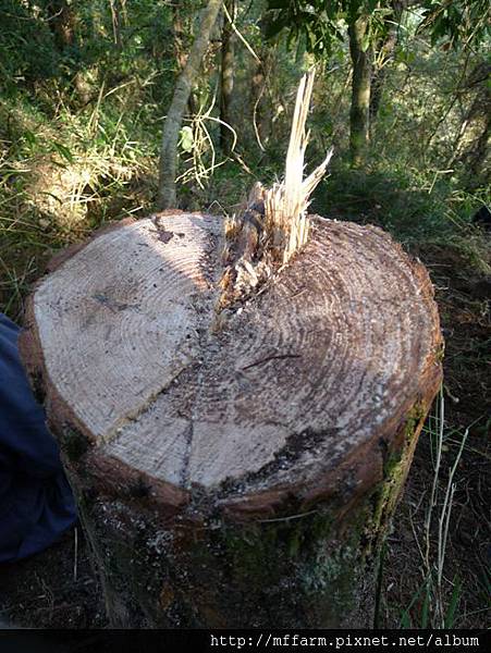 一整天下來我們總共砍了兩棵樹,從一開始的選樹便由我們三人小組和阿德老師一起討論,看樹的方向、枝條多不多,長的直不直,該如何倒下等。第一棵樹直徑約為19公分,第二棵較大,約29公分。在砍的過程中大鋸子、小鋸子交錯使用,我們比劃著切口和椎口的方向,推算著樹倒的方向,是否有其它樹可以卡著緩衝。