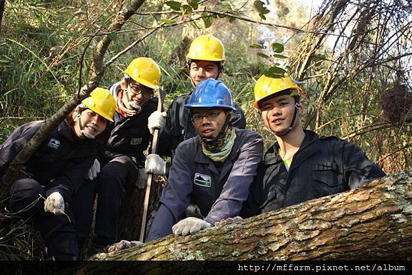 這些想法及疑問不斷的在我們的心中盤旋,後來老師及農場人員在大家分享完畢之後給我們一些回饋及回答,步道並不是只給人走,也希望是在動物移動路徑內,砍樹是希望可以就地取材,而非從外地移入不屬於這裡的任何建材,手作的用意也是在這裡,不用電鋸,完全手工,對當地來講,一切都算是在合理的使用範圍內,若內心還覺得有些不自在,在砍樹之前可以先抱抱它,跟它說說話,或是有些同學把被挖除但仍完整的腎蕨在步道製作完成後重新種回上邊坡,變成一排整齊美麗的小花園,成為帶給人希望及生命力的「春神」。在砍樹之前我也和樹說了一些話,希望它可以理解我們,我想,不管做了什麼,心態最重要吧!