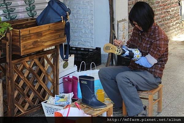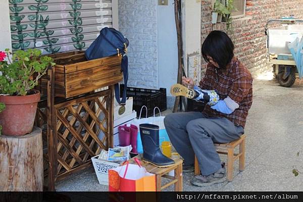 解說員郁葶正在彩繪同事們淘汰的雨鞋,讓這些雨鞋擁有全新的生命與價值。