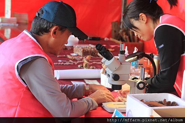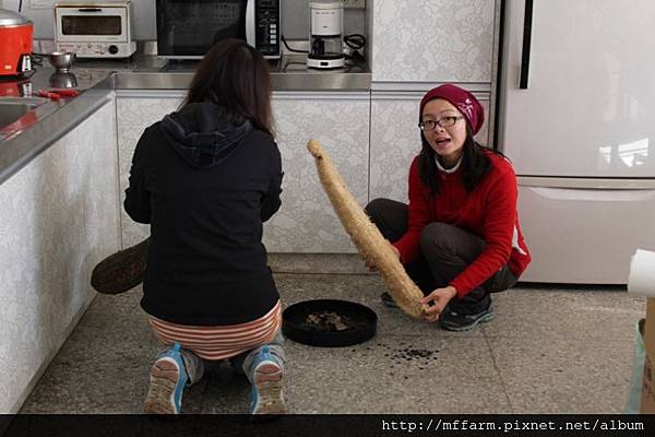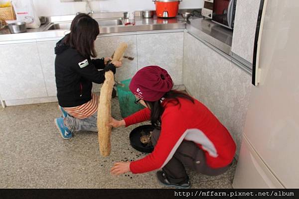 教研組工作同仁趙俐雅與解說員韻如,整理絲瓜絡用來布置一葉蘭展示室,並將部分種子贊助生生不息種子站。