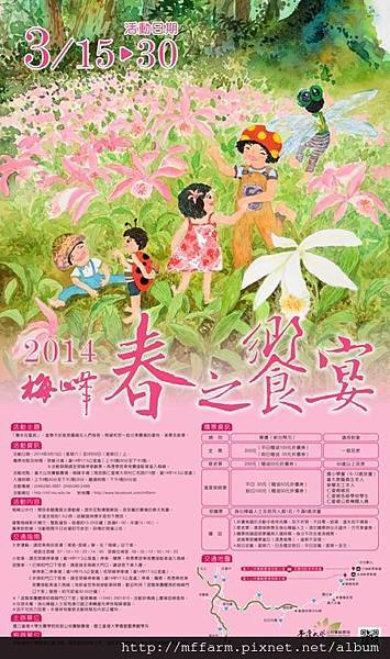 臺大山地實驗農場以「園來在藝起」為主題,舉辦的2014年梅峰「春之饗宴」,即將於3月15日至30日盛大展開,活動期間採購票入園方式。今年,於活動中注入嶄新元素,歡迎前來領略春的繁花勝景,以及一年初始的無限春意。