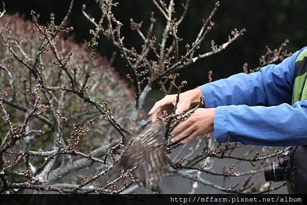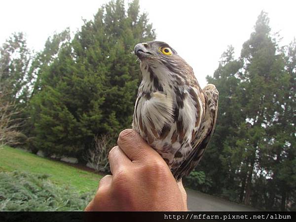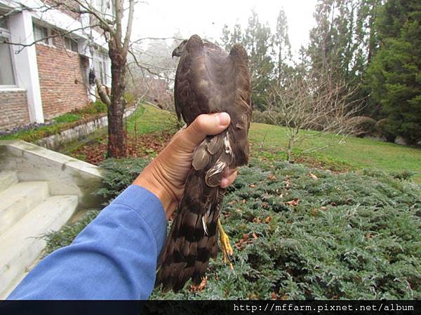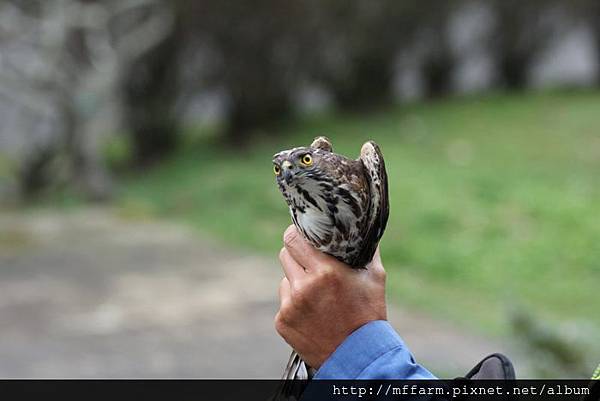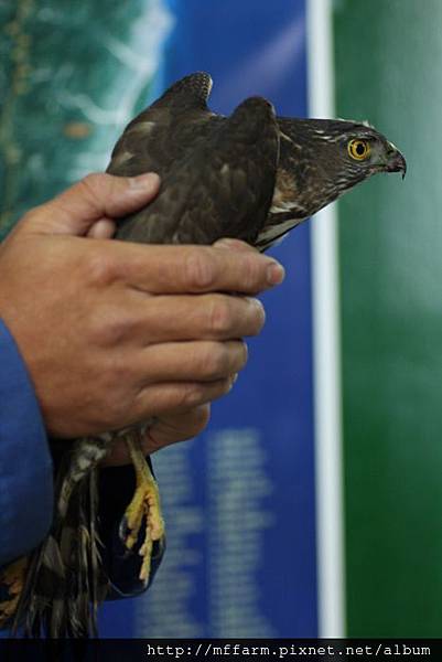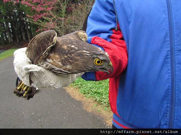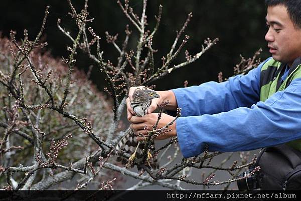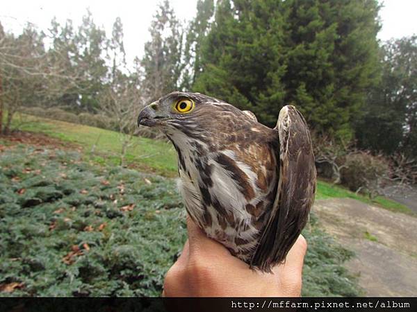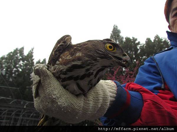 First Wu-gine found this raptor pull off feathers from a pigeon on the trees beside the dormitory before. After he left, this raptor took pigeon through trees to laundry area. Then A-Fen, another co-worker lives in the same building with me rode scooter pass clothesline area. This raptor got a shock from her and flew away immediately. A-Fen saw the pigeon corps then found the raptor stood on the trestle of blueberry yard. It might be too rash to get hooked by net of blueberry yard. Wu-gine’s being at this dormitory at this moment was coincidence. He caught this raptor from the net easily. I followed him to office and shew it to co-workers ,because watching a raptor so closely is very rare. Wu-gine had to finish duty, so he gave me this raptor and left. Finally I placed it on a peach tree, but it didn’t stood on the tree then just flew away. Then the raptor was disappear in the wall of trees.