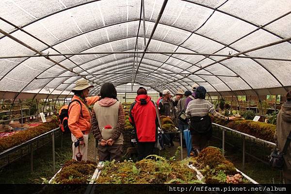 山野草展示室裡的分享,學員們用手輕觸撫摸柔軟具療癒效果的苔蘚,驚嘆植物世界的微妙與偉大。。