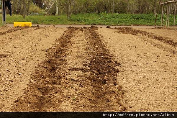 工作人員說明示範種植時的注意事項,考量馬鈴薯生長範圍,種球間需要留有一定寬度。。