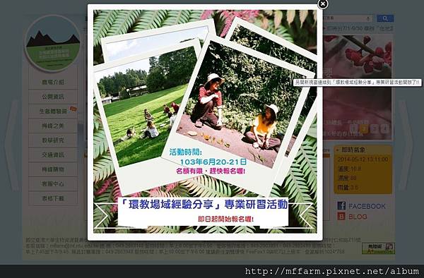 一進到官方網頁首頁,「廣告頁面」提供您得知臺大山地實驗農場所即將推出的最新活動訊息,亦可點選廣告頁面,即可進一步了解相關資訊。瞭解相關訊息後,即可點選右上角的「叉叉」符號將廣告內容關閉。