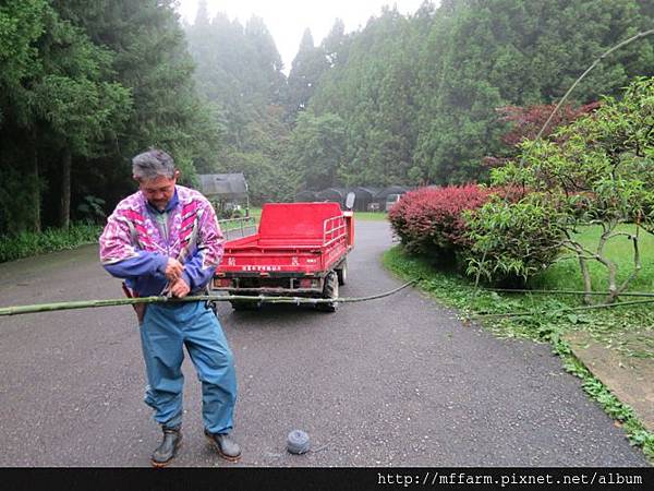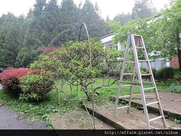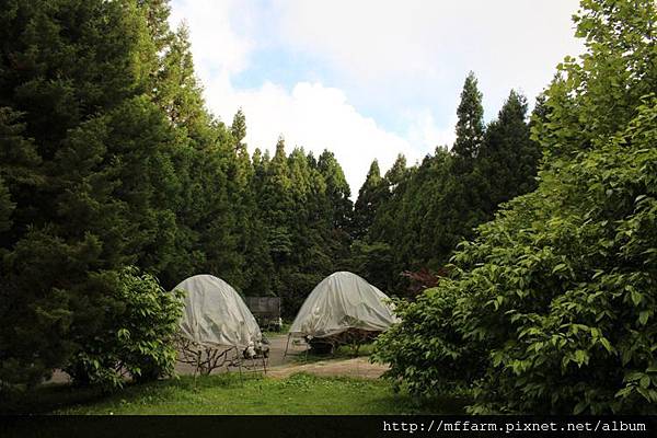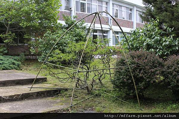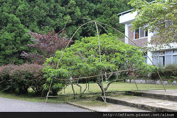 關於雨水對植物的影響,我們人類也許並不容易觀察得出來,有時候需要長一點的時間才得以發覺其中有何變化,例如像去年梅雨季時的大雨,導致梅峰蘋果減產的狀況。因此當今年的梅雨季又是連綿的大雨甚至是豪雨不斷的態勢下,梅峰的工作人員在跳早操時,就觀察到行政中心大門口兩旁的矮桃生長勢不佳,之後工作同仁便利用農場現地既有的竹子,以及塑膠布幫行政中心周遭的矮桃們都特製了「矮桃雨棚」。小巧精緻的雨棚,替矮桃們撐起了一片小巧的天空,就算是在連綿的雨季裡,也可以讓矮桃們無需承擔太多雨水的沖刷及考驗。