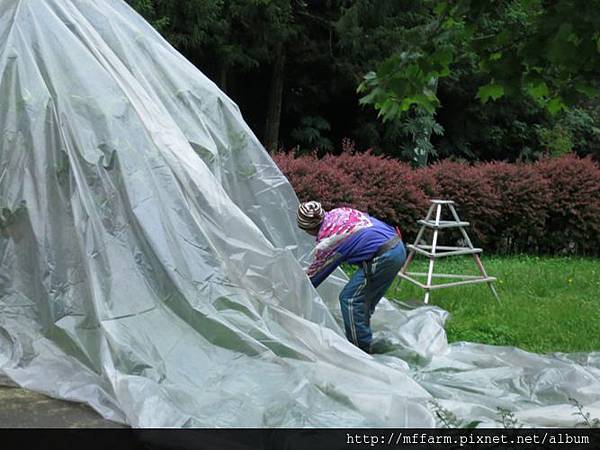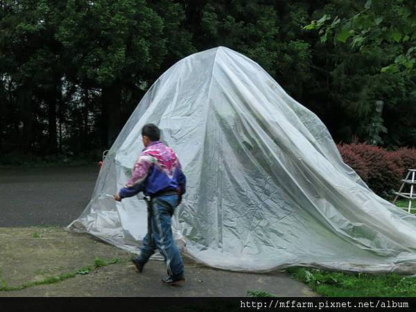 巴度大哥正在建置矮桃雨棚。