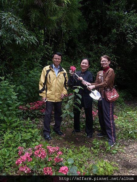 場長、場長夫人與紅房子合影。