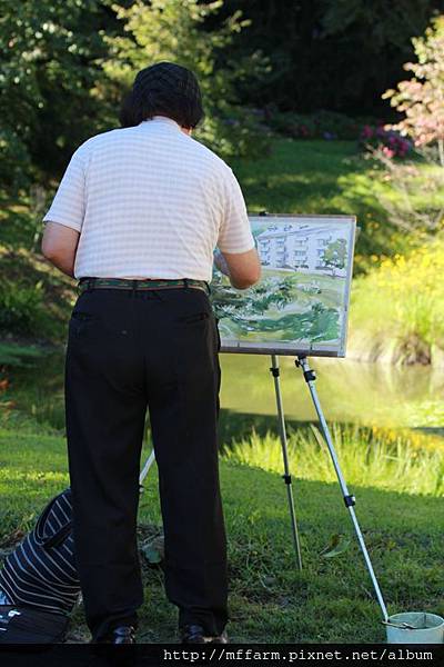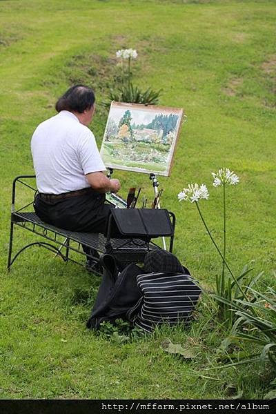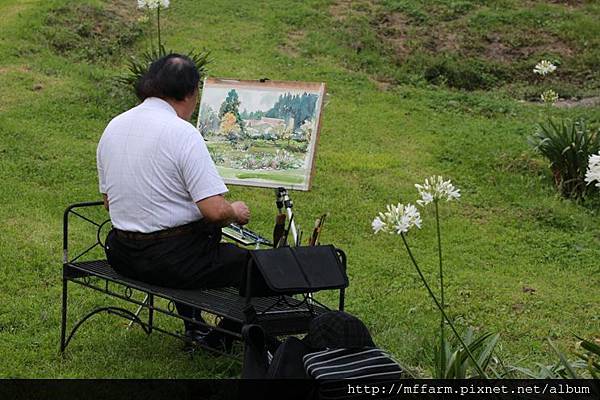 6日下午在黑水塘畔愛情花叢邊作畫的李文增老師。