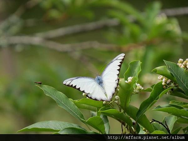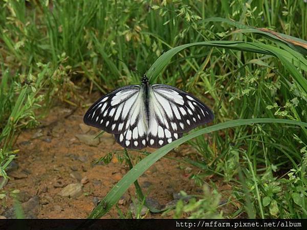 雖然是平地常見的蝴蝶,但是在梅峰的上一筆觀察記錄已是三年前的夏天,無怪阿雄看見牠要興奮好幾天了。牠廣泛分布於東洋區的大部分地區及印尼東部,在臺灣沒有長像相似的蝶種,重要的特徵是後翅腹面外緣有黑褐色寬帶,體型差異很大,也是尖粉蝶屬中可長到最大的。雄蝶前翅背面純白而在邊緣帶有黑色三角形,明亮的對比讓初次見到牠的我,感到詫異、迷人。