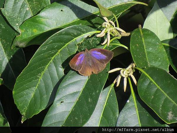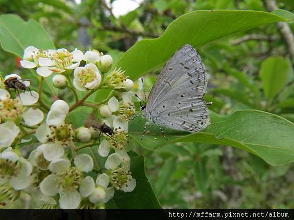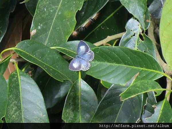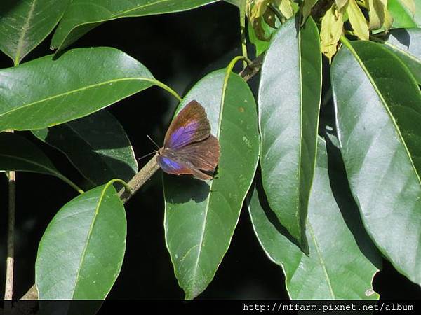 不過,來到了位於中海拔的梅峰,有另一種比起玳灰蝶,與燕灰蝶更為相似的小灰蝶,是分布局限於海拔1500-2500公尺而數量少的堇彩燕灰蝶(淡紫小灰蝶),燕灰蝶背面藍色,腹面底色暗褐色,堇彩燕灰蝶背面褐色帶一點藍紫色,腹面底色較淺。呵呵!若實際上看到牠們,是不是有點感到頭昏眼花啊?