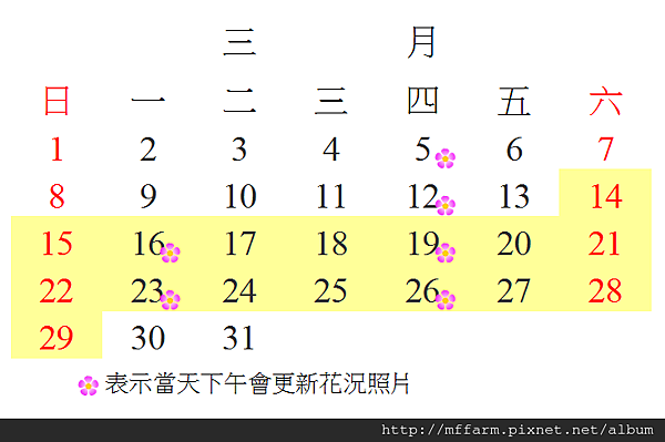 請點此聯結到農場相簿,將為您呈現最新花況的照片。(預計更新日如下圖;包括桃花廊、溫帶花卉區、大平台等區域,將開啟新視窗)
