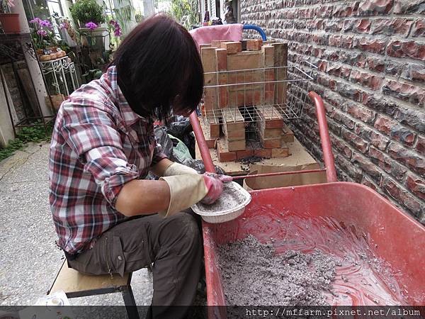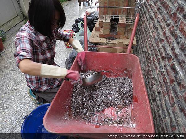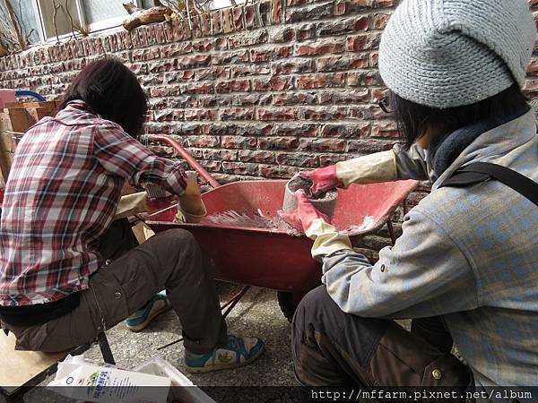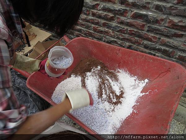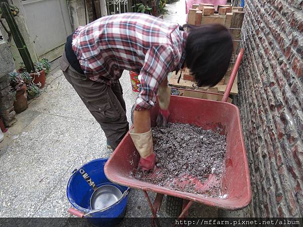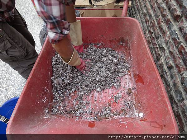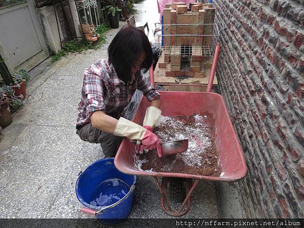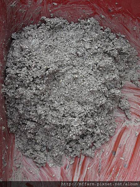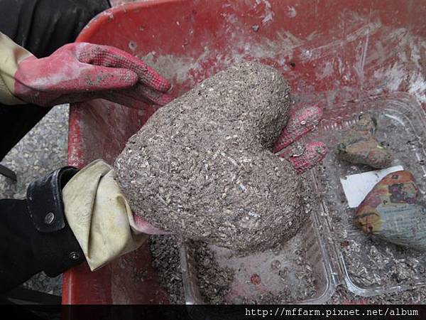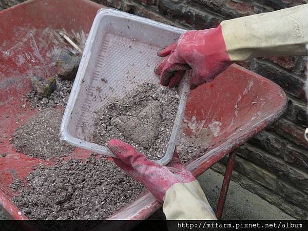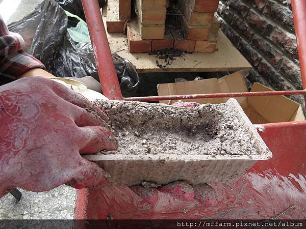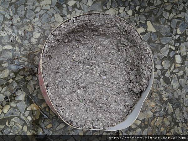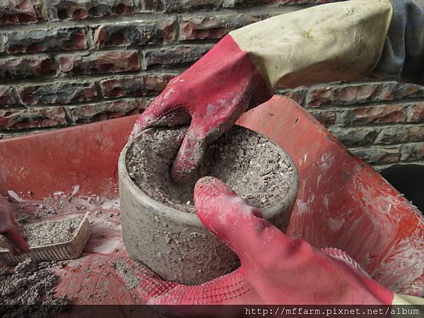 步驟一:將水泥、椰纖、紙屑、咖啡渣等以等比例加水調配成黏稠狀,輕捏有微量水分滲出即可(有硬塊或小石子挑出,不然之後做好的成品容易裂開)。
