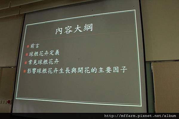 球根花卉的種類很多,在平地常見的大概就是孤挺花、野薑花等,而在位處海拔2100公尺的臺大山地實驗農場,則擁有非常多樣的球根花卉種類,像是白頭翁、陸蓮、大理花、郁金香等,因此在2014年9月26日,李美玲副場長特別為園藝志工、場外的朋友及場內的員工共45人,以球根花卉為題,進行分享。讓大家對於球根花卉有更深入的認識與了解,在種植或觀賞時,能夠擁有更多的樂趣與體會。