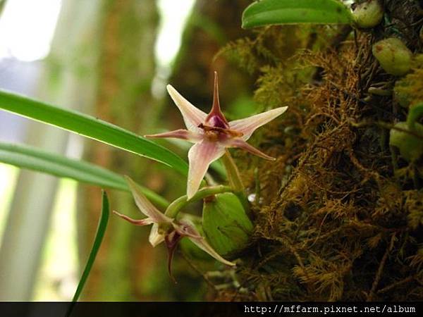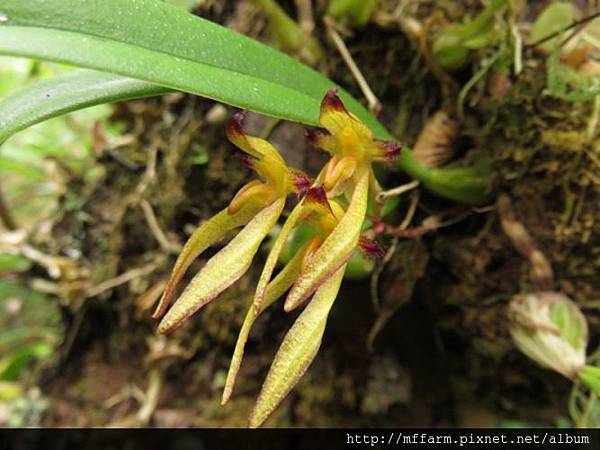 12/12毛藥捲瓣蘭,盛開中。通常一穗兩花,這穗三花比較少見(梅峰蘭園,阿土攝)。