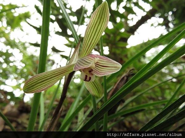 細葉春蘭亦屬於蘭科蕙蘭屬,有著淡雅迷人的香氣,葉子細長,葉寬2.5-2mm,是春蘭(葉寬7-12mm)的變種,不開花時在森林好像野草。仔細觀察她的花為乳白色或淺綠色,有些具紅色線紋有些則純白,花的個子小小,藏在葉子間,是隱匿的清新。