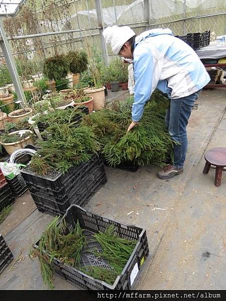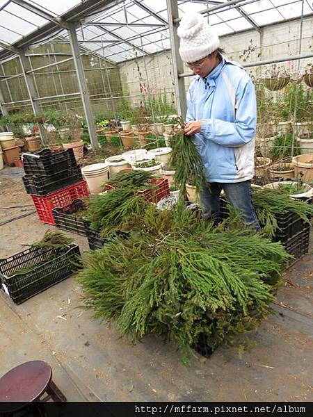 首先將蒐集到的柳杉枝葉扎成一束一束的。