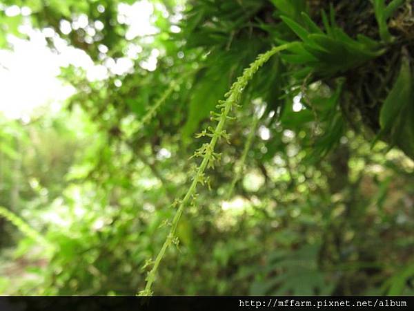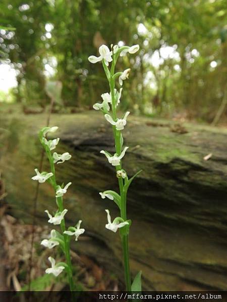 6/7 二裂唇莪白蘭 今年第一串花序才開始開沒多久,不同株的花期延續起來應該可以一~二個月。 (梅峰蘭園,阿土攝)