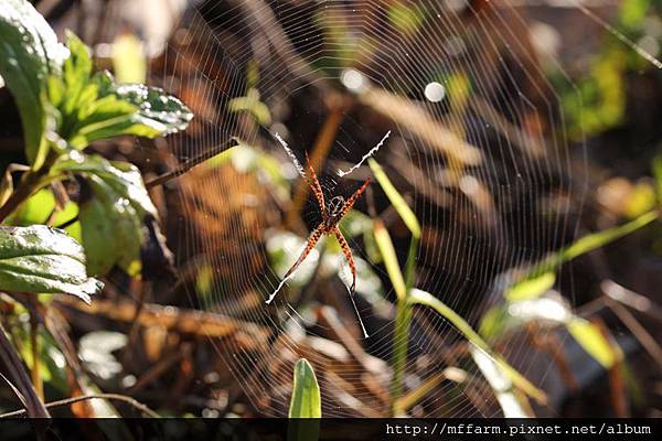 陽光下閃閃發光的橫帶人面蜘蛛的立體蛛網。(攝於春陽分場)