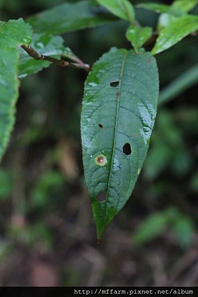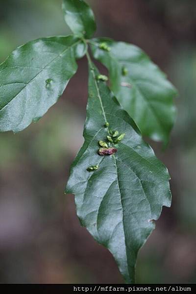 ※圖說:玉山假沙梨葉片上方形狀不甚規則的癭。(140422攝於屯原至天池路上)