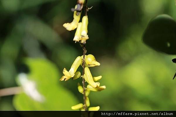 有著好長名字的它,是會纏繞在其他植物身上,開著一串串下垂、鮮麗黃花的豆科植物,所以它也會結豆莢,豆莢裡的種子成熟是藍黑色的,非常漂亮。