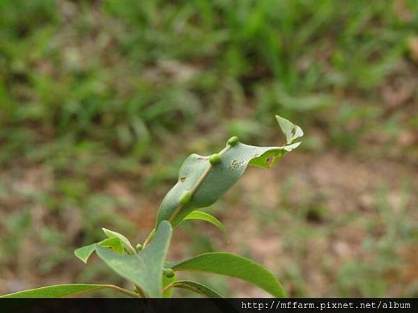 ※圖說:山胡椒的癭長在葉片背後的主脈上,像一顆顆小綠豆。(150511攝於埔里桃米土龍窟)