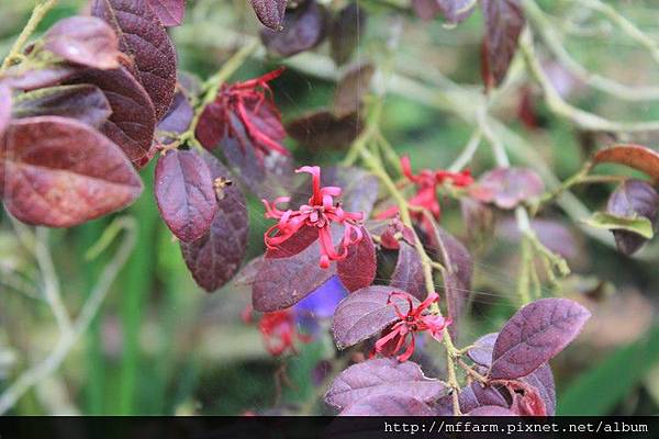 要仔細找才能看見紅彩木藏在紅葉間的花朵。