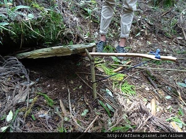 為了讓獵物們能走上陷阱這條路,除了要先觀察動物的足跡,在動物出沒路徑上架設陷阱,當做好陷阱後,也要拿一些藤蔓、雜草做適當的掩飾,甚至把旁邊其它可以走的路徑阻斷,讓獵物覺得不太好走,就會不自覺的往看起來較好走的陷阱一途了!