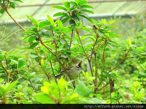 玫瑰園內叼樹枝準備築巢的冠羽畫眉