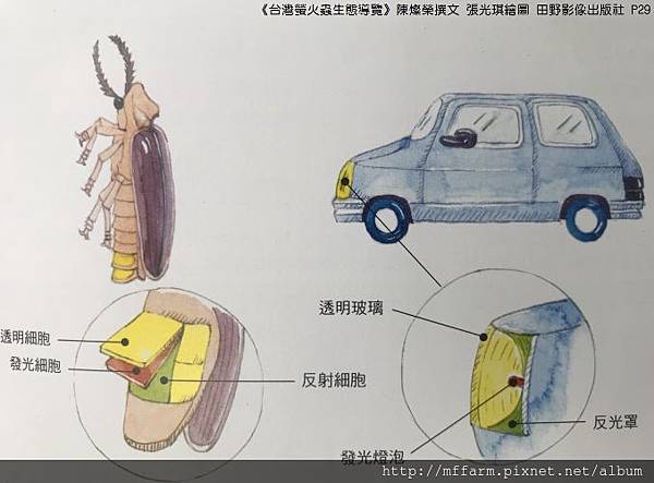 螢火蟲的光雖然小小的,卻讓人覺得好像很亮的樣子,感覺很神奇,原來是因為牠們發光器的構造,就像我們的車燈構造呢,最下層有個如同反光罩的反射細胞,中層是燈泡、外層有透明遮罩。不曉得是我們學牠,還是牠們像我們呢?