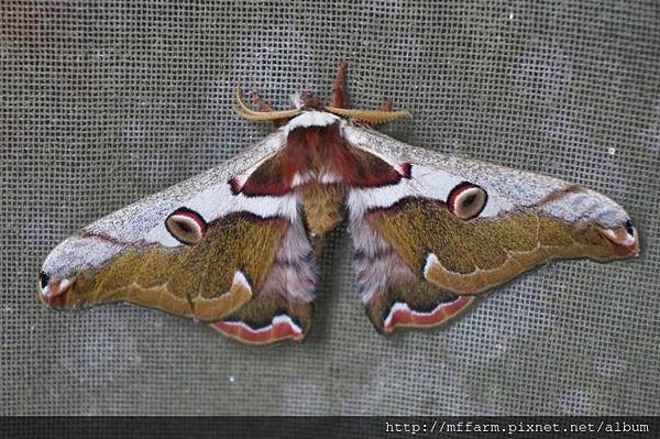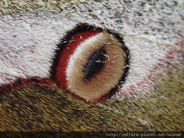 綠目天蠶蛾的眼紋也獨具特色,彷彿黑色鳳眼般的花紋,被淡綠色澤包圍,搭配白色眼線與紅色眼皮,最後再圍上黑色外框,猶如古典東方美人的神韻,令人神魂顛倒。