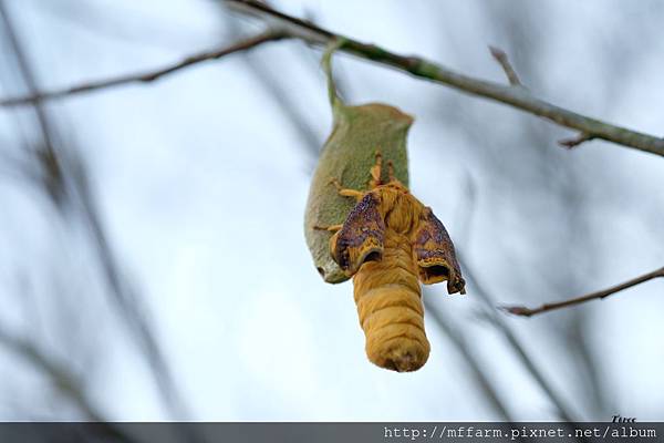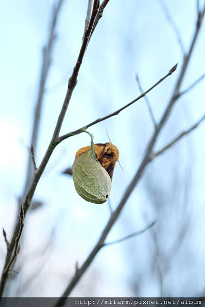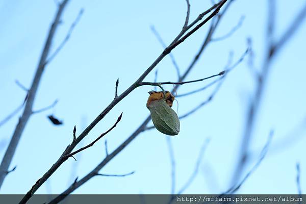 快天黑了,溫度逐漸下降,回程路上,見一顆頭從綠色繭上鑽出,又是一位不畏寒冷,準備加入宴會的佳賓呢!鑽出後,牠趴在繭上休息一會兒,準備將皺縮的翅膀撐開,這是個重要階段,急不得。這對牠們是再自然不過的連續動作,在我看來,卻充滿著生命的驚喜。
