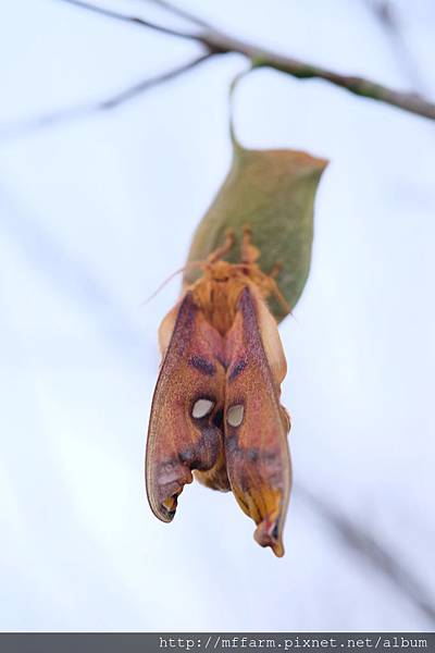 數一數整條白楊步道,樹枝上見到兩兩一起的有七對,單獨一隻的大約三四隻。銀目天蠶蛾們就像約定好了般,準備在聖誕節這幾天舉辦盛大宴會,紛紛從夢幻蘋果綠的小空間裡羽化出來,盛裝打扮後,迎接生命中的另一半。可惜牠們傳唱的情歌我們是聽不到的,因為蛾傳送情意的方式並非發聲,而是雌蛾從腹部腺體散發性費洛蒙,雄蛾發達的羽毛狀觸角接收到訊息後,便會往性費洛蒙濃度高的地方飛去,成就彼此的重要任務。
